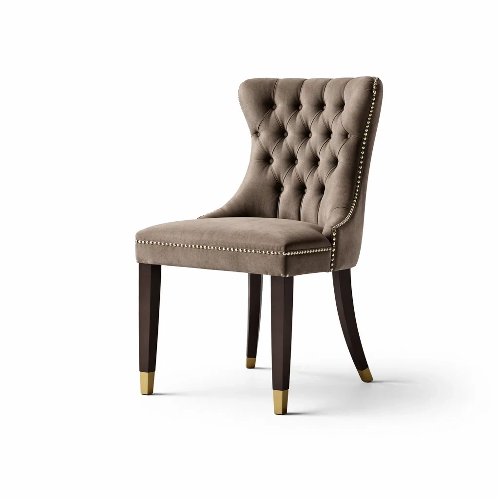 Sedia da pranzo in velluto marrone con dettagli metallici