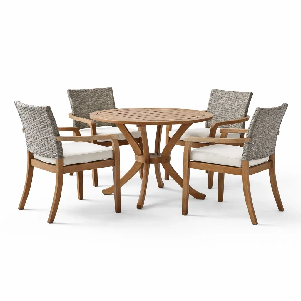 Set tavolo e sedie con tavolo rotondo in legno di teak e quattro sedie in legno e rattan sintetico grigio