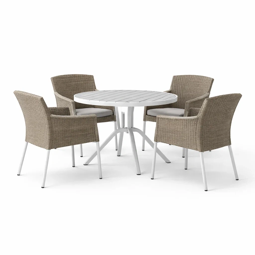 Set tavolo e sedie da giardino con tavolo rotondo in legno e quattro sedie in rattan grigio