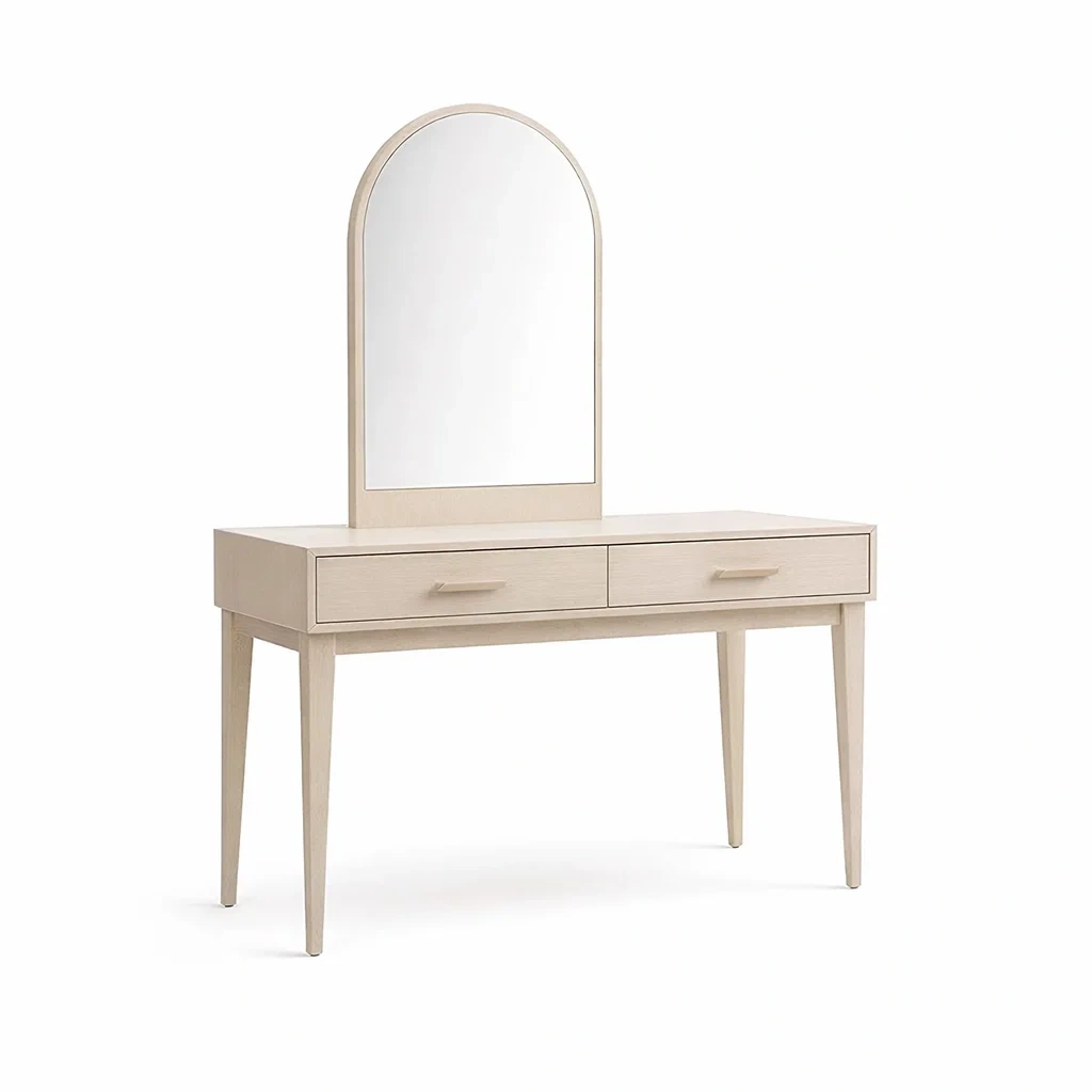 Caratteristiche: 1 ripiano principale, 2 cassetti, specchiera integrata con forma ad arco